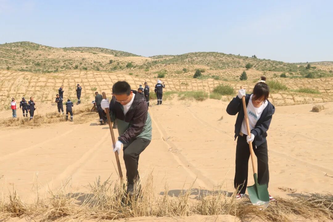 活动现场,按照技术人员讲解的防沙治沙技术要点,志愿者们各司其职、默契配合,分铺草束、压实固沙,每道工序都有条不紊、一丝不苟。经过一上午的奋战,数列规整的草方格在沙地上整齐排开,牢牢锁住流沙,为荒漠披上防护网。