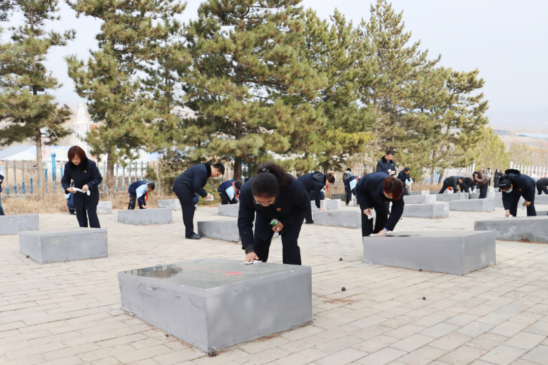 在纪念碑前,检察人员身着制服、整齐列队,肃立默哀。 向为国家和人民利益英勇献身的革命先烈致以最崇高的敬意与深切缅怀。随后,检察人员擦拭墓碑、清扫陵园,以实际行动守护英烈荣光,传承英烈精神。