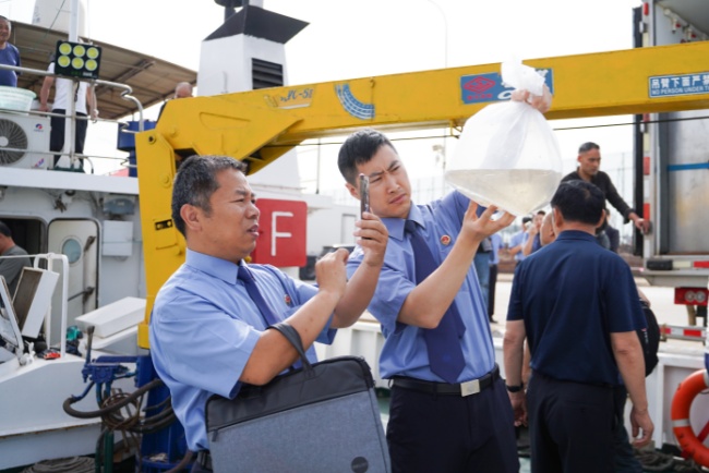 近日,山东省日照市岚山区检察院联合相关行政部门对该院办理的一起非法捕捞公益诉讼案组织开展增殖放流活动,共计在岚山渔港附近海域投放各类鱼、虾、蟹苗1500万余尾,为浩瀚海洋增添了新的活力。图为检察干警在增殖放流前查看鱼苗情况。