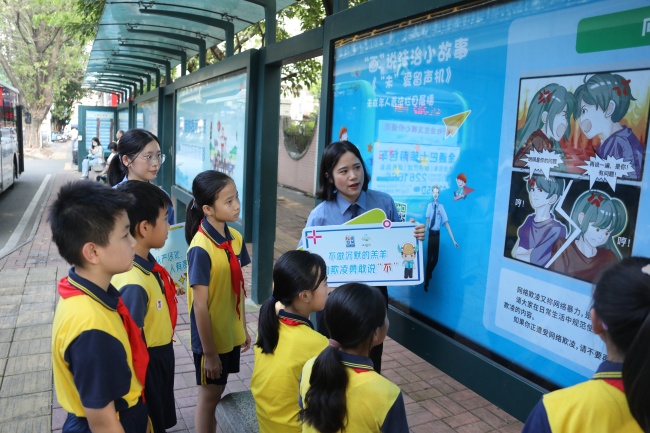为了让未成年人保护法治观念常态化、生活化、大众化,近日,广东省惠州市惠城区检察院创新普法形式,将预防校园欺凌、性侵害等抽象法律知识转化为吸引人的漫画,做成展板后,在惠城区20所中小学附近站点,以及5个主要公共场所站点投放。图为惠城区检察院干警向学生们介绍公交站台展板上的普法漫画内容。(转自:最高人民检察院)